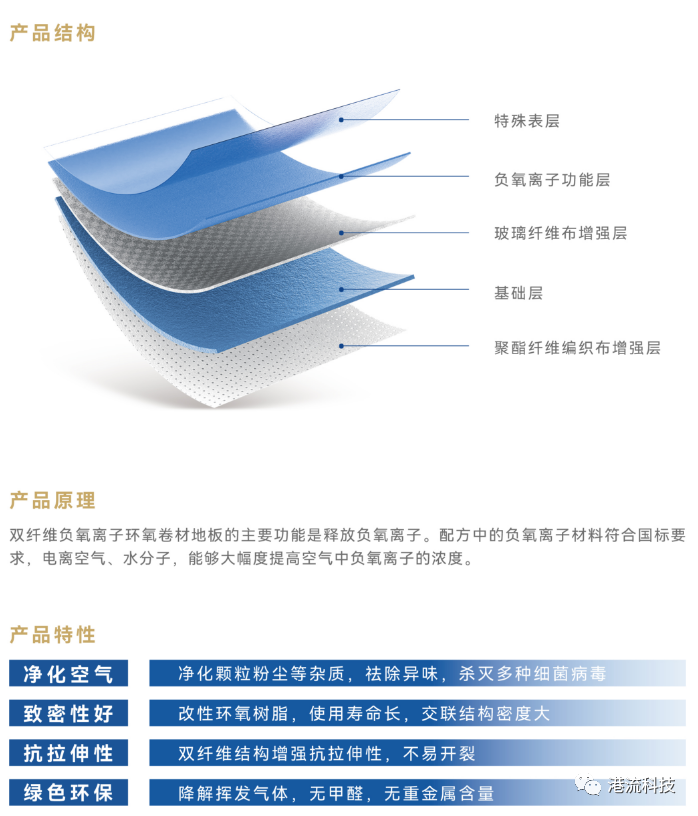 港流科技现拥有12大类功能性双纤维环氧复合材料卷材地板,配方体系均不添加有机挥发性溶剂,生产环节无污染,产品零甲醛、无重金属含量,VOC含量低于国标要求,且施工环节无尘、无有机挥发物。其中,双纤维负氧离子环氧卷材地板更是采用环保工艺,不仅能够净化颗粒粉尘等杂质,有效祛除异味,更能降解挥发气体,杀灭多种细菌病毒。